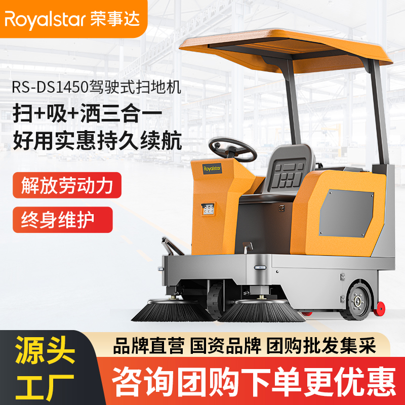 榮事達(dá)DS1450駕駛式掃地機(jī),掃灑吸一體機(jī),一遍干凈輕松省力,180L塵箱容量告別多次傾倒,噴霧抑塵有效控制揚(yáng)塵,...