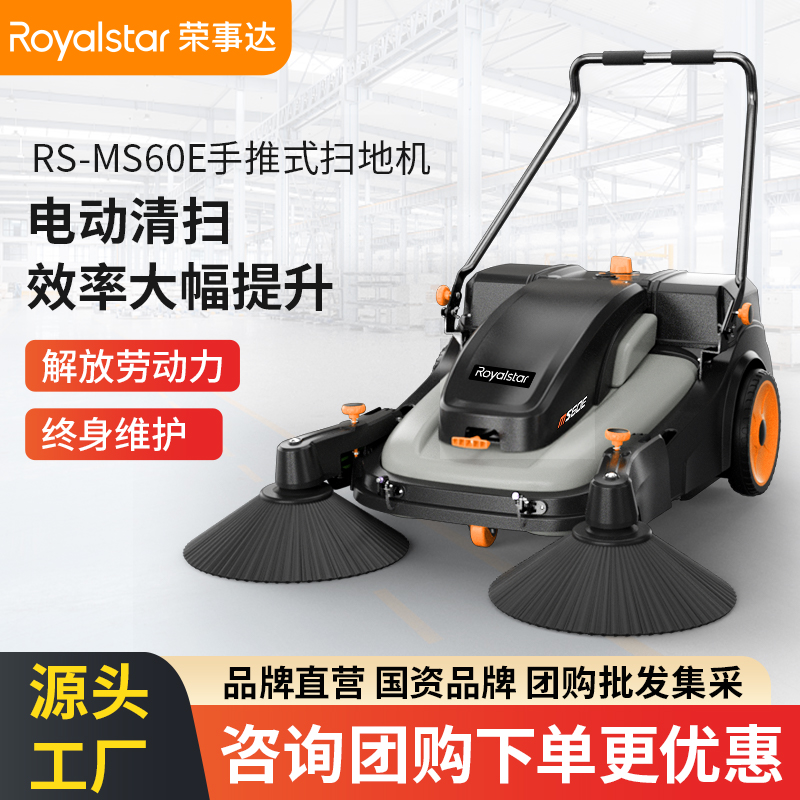 榮事達MS60E電動手推掃地機讓清潔變得更高效,多場景適用,+5000平方米廠區只需1人1機僅需1小時就能完成清潔。